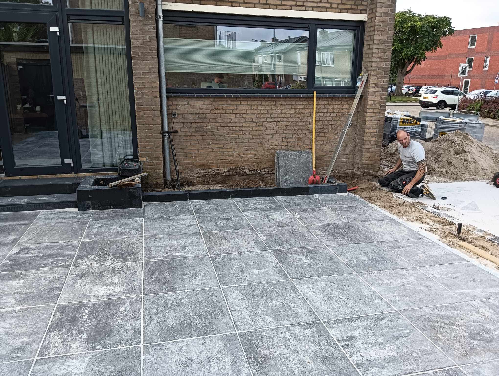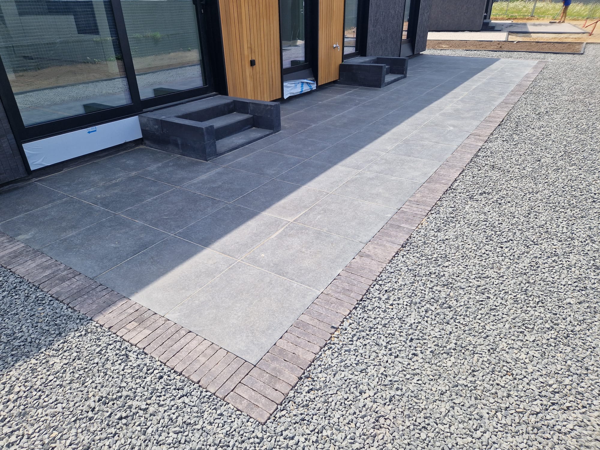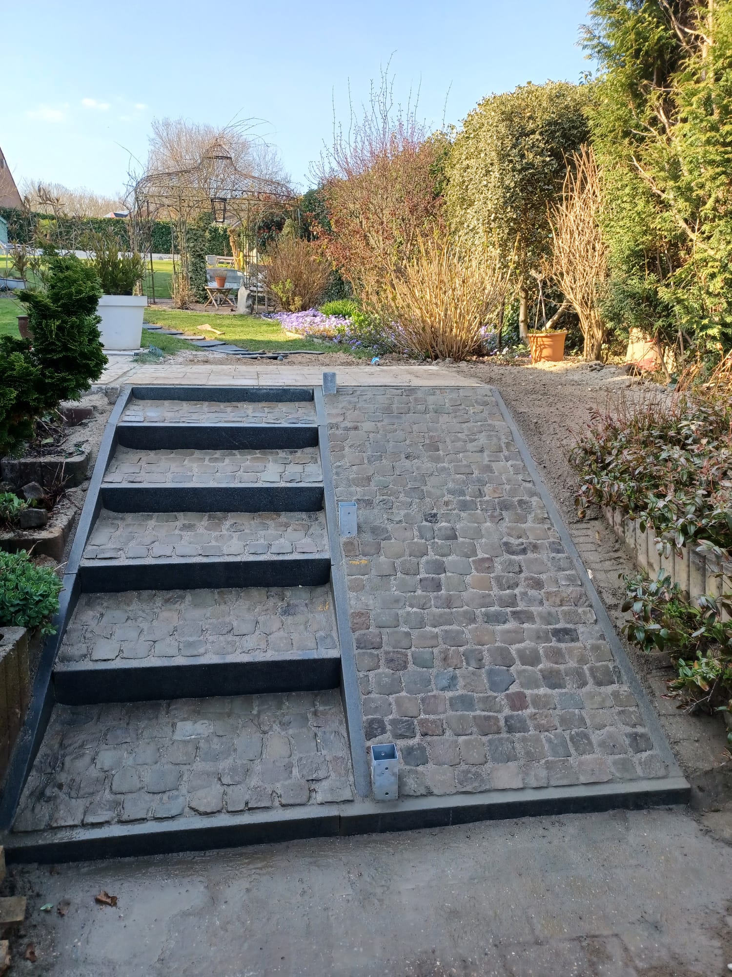 Strakke (sier)bestrating die nauwkeurig wordt aangelegd en jarenlang mooi blijft, met oog voor detail in trappen en plantenbakken.