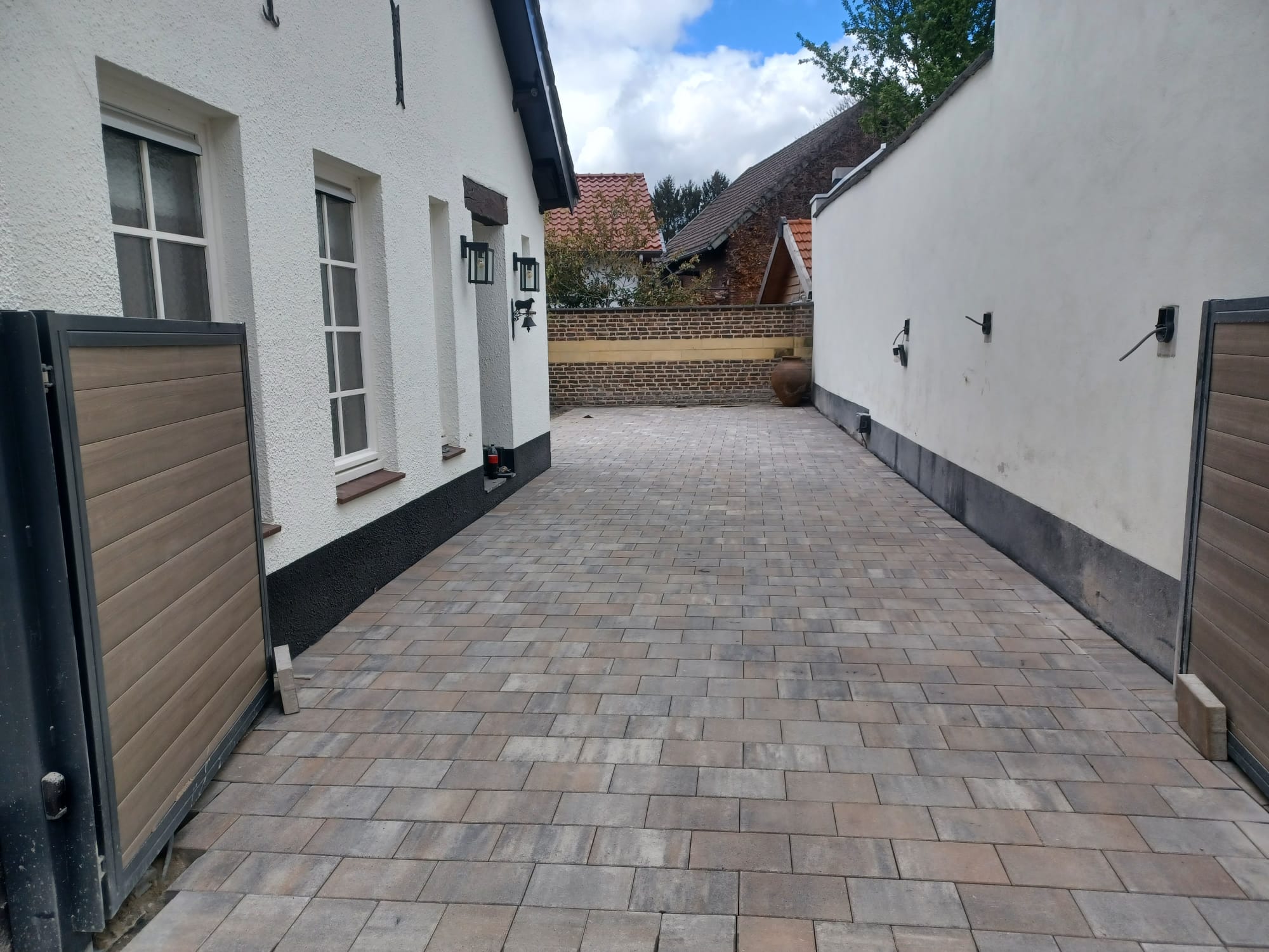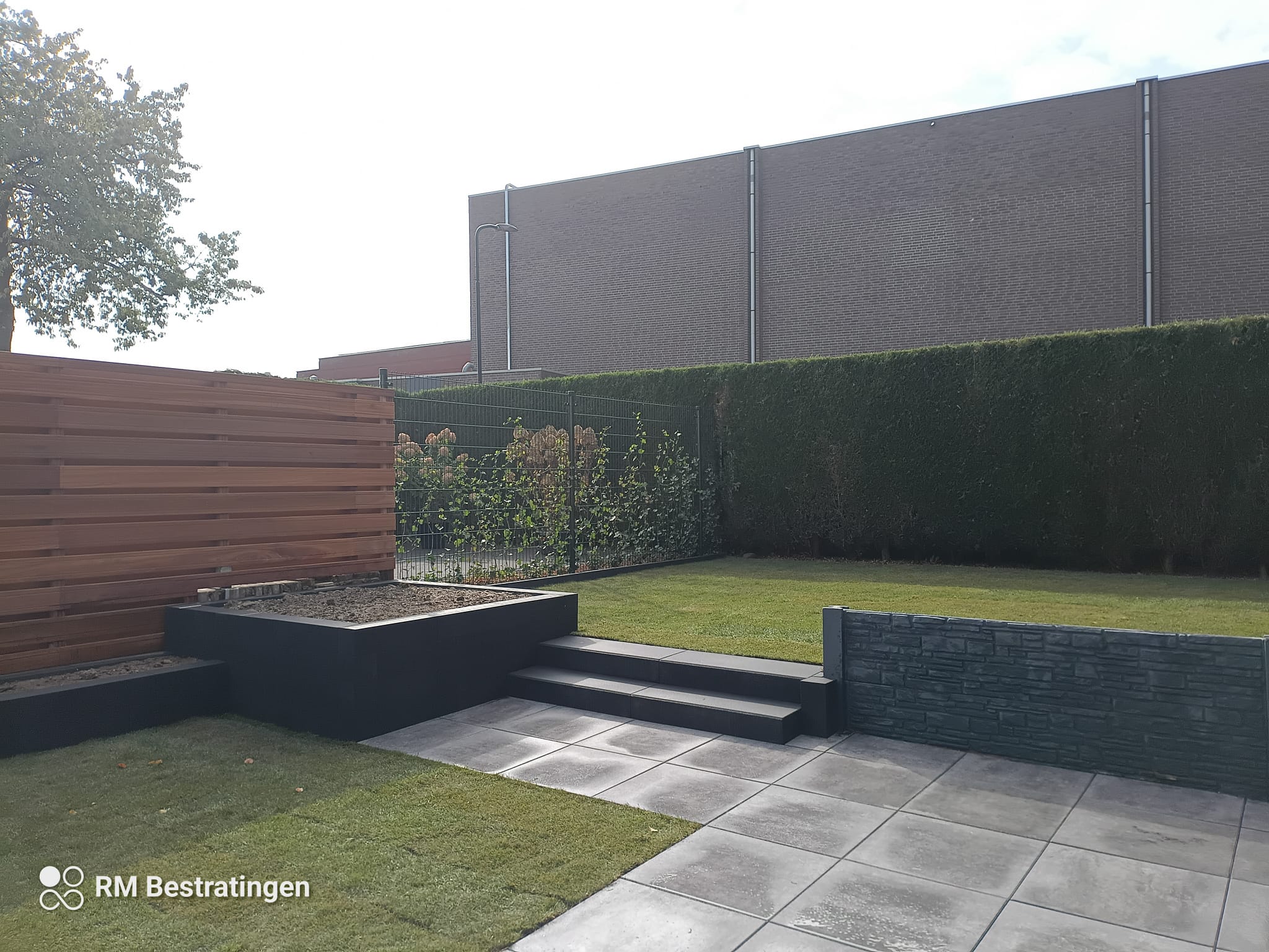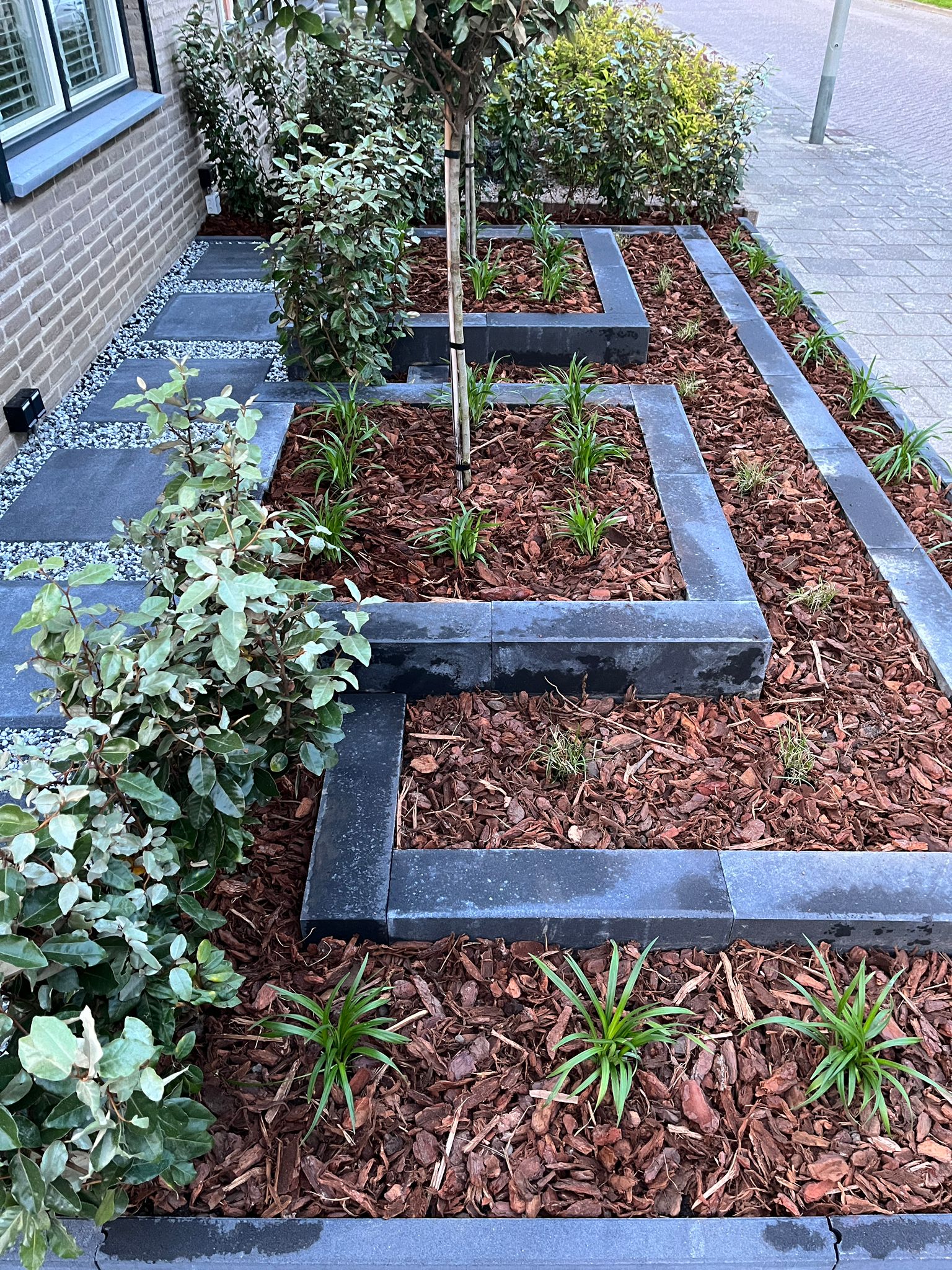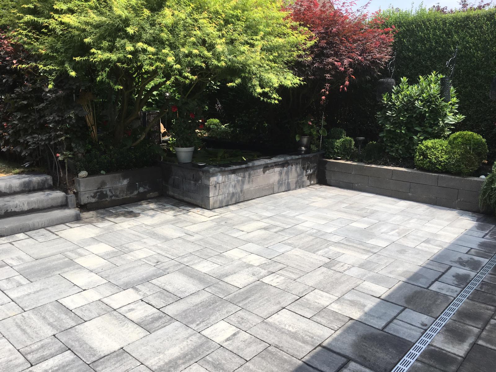 Strakke (sier)bestrating die nauwkeurig wordt aangelegd en jarenlang mooi blijft, met oog voor detail in trappen en plantenbakken.